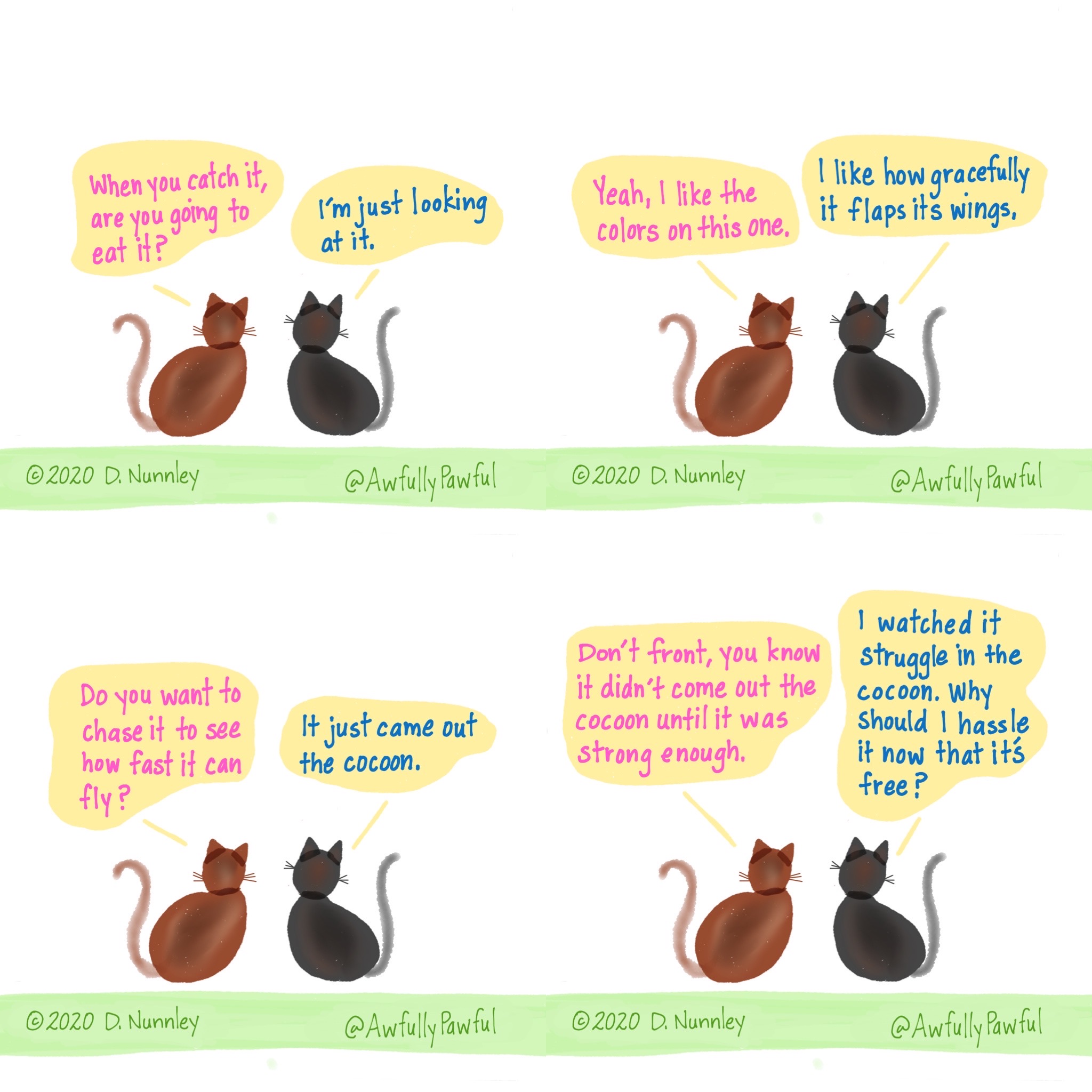 Check out Awfully Pawful a webcomic series (and 372 page book!) that is told through the eyes of feline frenemies, Tiger and Mak.  It's a tad awful, a bunch of fun, and full of truth!